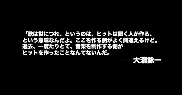 歌は世につれ、というのは、ヒットは聞く人が作る、という意味なんだよ。ここを作る側がよく間違えるけど。過去、一度たりとて音楽を制作する側がヒットを作ったことなんてないんだ。作る側はあくまで”作品”を作ったのであって”ヒット曲”は聞く人が作った。